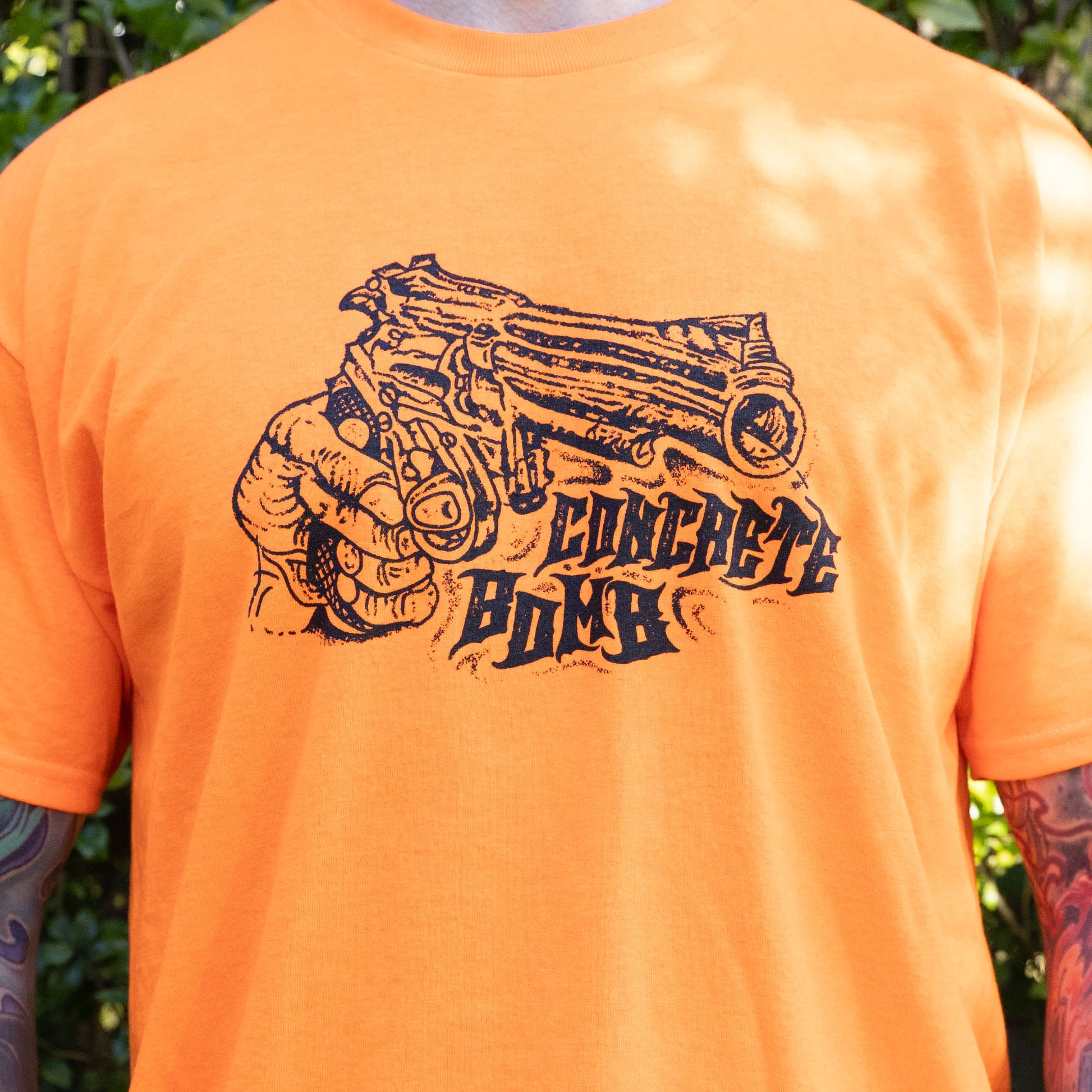 Front screenprint on Safety Orange Gildan Heavy Cotton tee. Designed by Concrete Bomb bassist Sam Wilson.